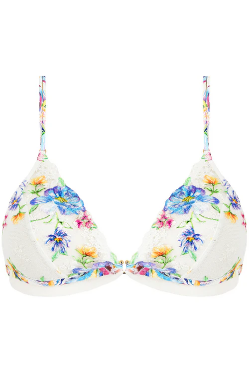 Indulge in luxury with the Baisers Legers Wireless Triangle Bra from Lise Charmel. Experience the ultimate comfort with soft cups, no underwires or padding, and adjustable shoulder straps. The printed embroidery cups and basque offer elegance, while the crisscrossing mesh straps add a unique flair.