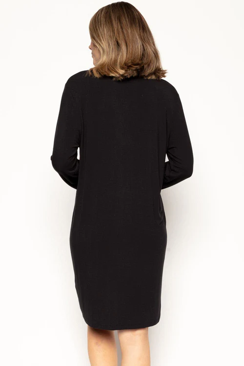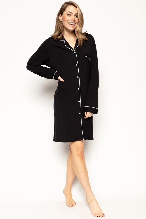 Superb comfort and elegance combine in the Beth revere collar, long sleeve jersey nightshirt. Made from beautifully soft modal and elastane, the nightshirt is trimmed with a light blue modal for a timeless and exquisite finish. The nightshirt has a revere collar, single pocket and fastens at the front with light blue, modal covered buttons. The perfect piece to lounge or sleep in cosy, comfort.
