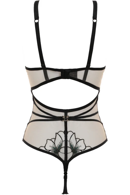 Indulge in the captivating allure of the Delicate Nymph Thong Bodysuit by Prelude. This luxurious piece is adorned with exquisite green and black tattoo-style floral embroidery, beautifully contrasted against sheer tulle. Elegant black satin strapping enhances your silhouette, while underwired cups offer support and lift. The bodysuit features adjustable shoulder straps and a multi-stage hook-and-eye back closure for a tailored fit. With an irresistible thong bottom, this bodysuit epitomises sophistication and sensuality, making it a must-have addition to your sheer lingerie collection.
