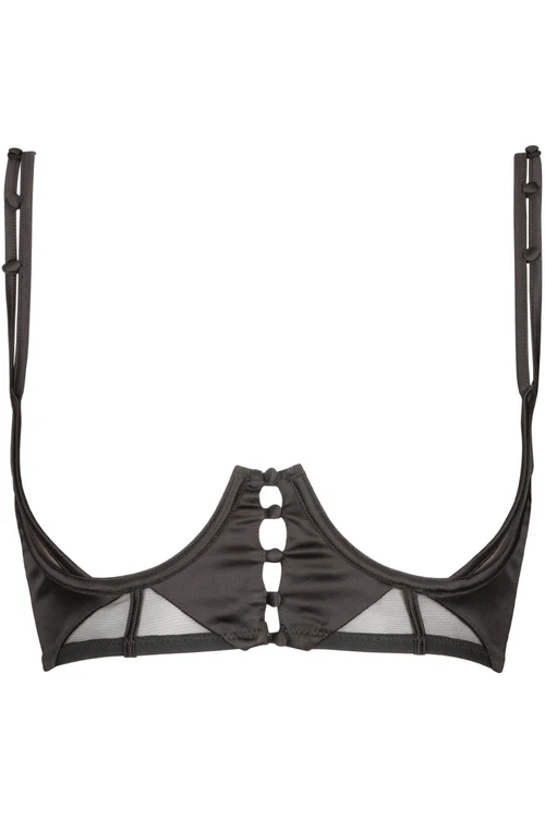 Erotic lingerie from Atelier Amour. Discover the Douce Insomnie Cupless Bra featuring stunning black satin & transparent tulle. Frame your voluptuous bosom and tease that spouse of yours. Despite its revealing look, this bra showcases the busts yet still looks elegant.