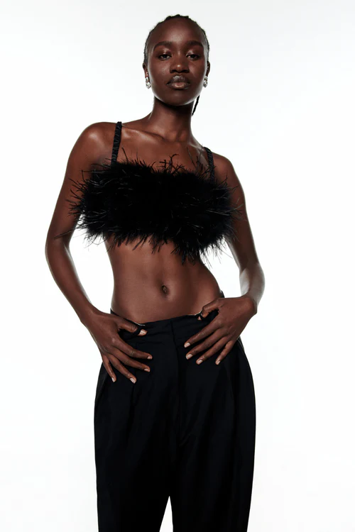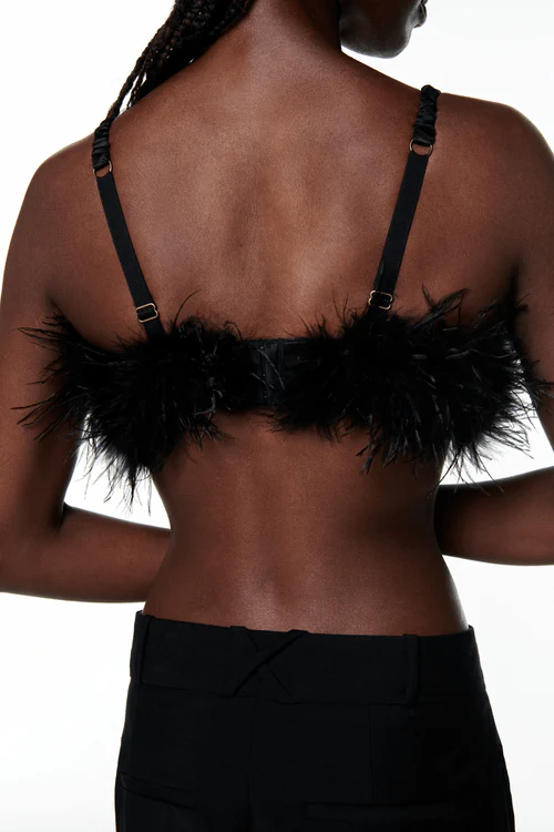 Make a statement on the dancefloor with the Love Stories Fanny top. This statement crop top features feather embellishments with detachable and adjustable satin shoulder straps. The hook and eye closure at the back allow for your desired fit.