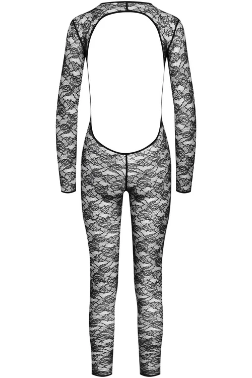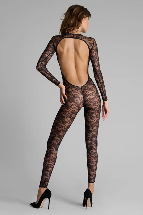 The Maison Close Flashback Long Sleeve Jumpsuit in black is a seductive piece that exudes sophistication and allure. This full-length catsuit is crafted from luxurious, semi-sheer floral lace with a body-hugging design that beautifully contours your curves for a sleek silhouette. Full-length sleeves and long legs create an elongated, elegant look, while the daring backless design showcases your back for an unforgettable effect. The smooth, flat elastic trim ensures a secure, comfortable fit, making this jumpsuit perfect for layering with lingerie or wearing alone with heels for a striking evening statement.