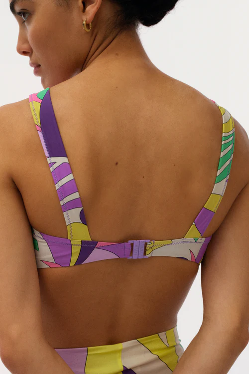 The Harper Bikini Top from Love Stories boasts a bandeau style in stunning lilac and pastel hues. Crafted from soft stretch fabric, it features fixed padding for added support and a fabric-covered ring at the centre front. The wide shoulder straps attached to the ring ensure a secure fit.