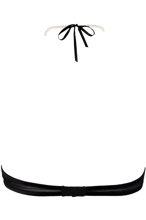• The velvet straps are adjustable by means of gold-plated adjusters, they cross the front of the chest thanks to two rings of ivory-coloured pearls, obtaining a natural push-up effect.