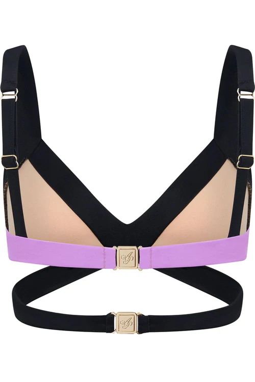 • Black, coral and neon lilac bikini top.