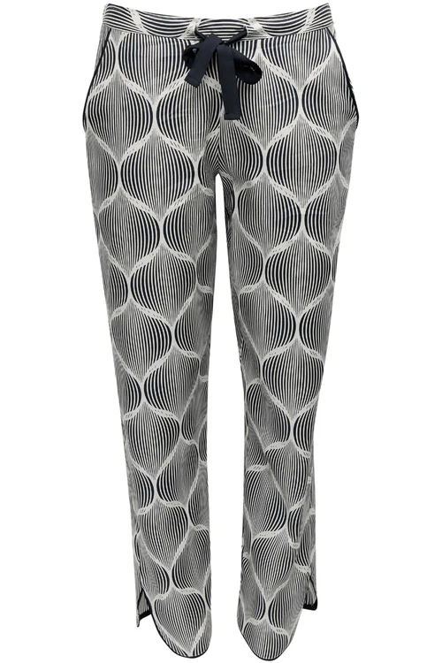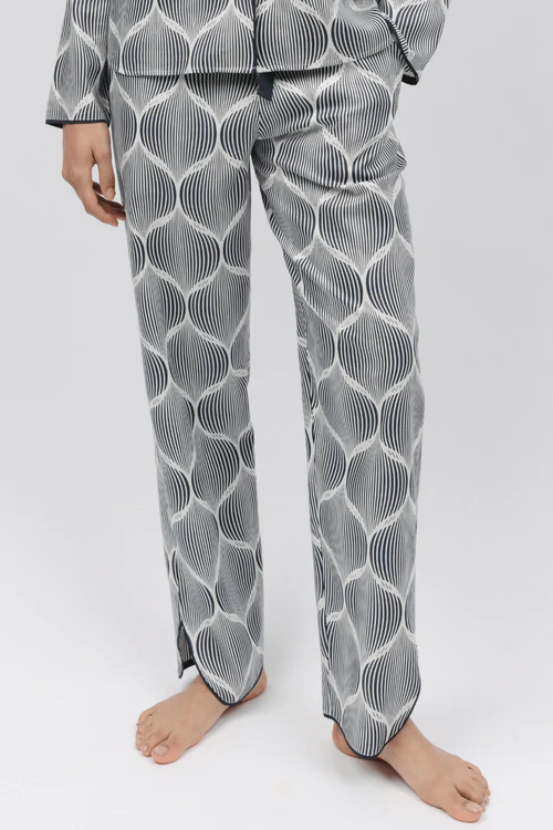 The Nicole pyjama bottoms are made from cotton and modal. They feature a charcoal and white geometric pattern. The trousers have two side pockets, elasticated at the back waist, with an adjustable front drawstring. Wear them with the matching pyjama top or slouch jersey top for a sophisticated look to relax or sleep in.