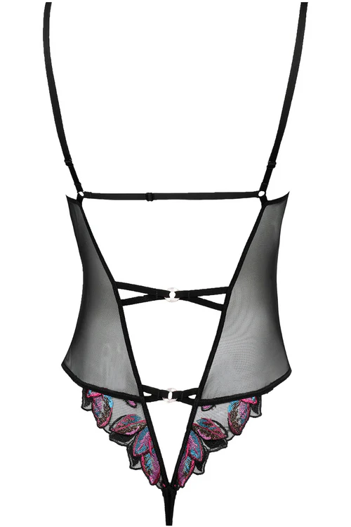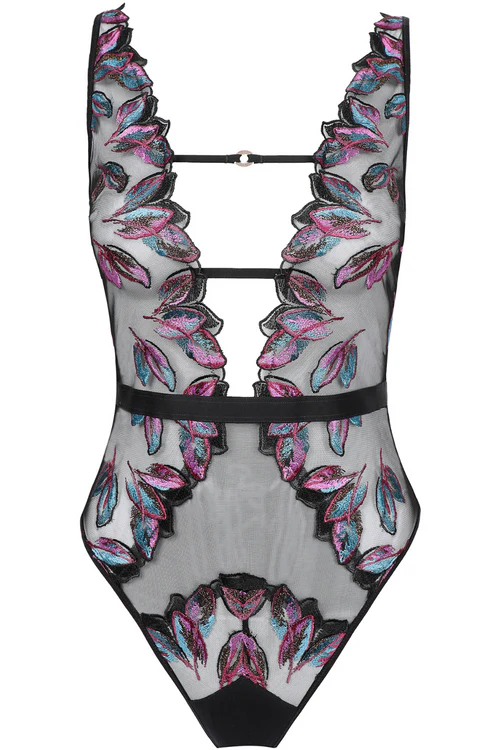 The Atelier Amour Oiseau de Paradis Thong Bodysuit is the ultimate expression of sensuality and elegance. Crafted from sheer black mesh, this sexy bodysuit features exquisite multicoloured leaf embroidery that adds a luxurious touch. The plunging V-neckline beautifully frames the décolletage, while a satin elastic belt flatters your silhouette. Adorned with golden rings and delicate black strapping, this bodysuit boasts adjustable straps for your perfect fit. The flattering thong bottom enhances your curves, making it an irresistible addition to your black lingerie collection.