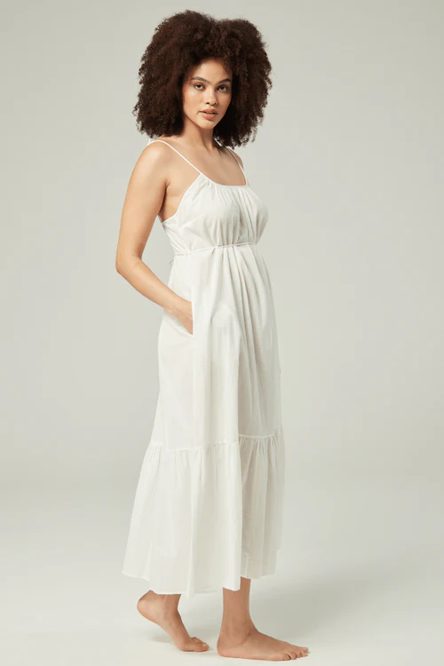 Upgrade your loungewear collection with the Organic Cotton Maxi Trapeze Dress! Crafted from 100% organic cotton, this lightweight and breathable dress features a maxi length, thin shoulder straps with a self-tie back. The loose fit and white sand hue provides a timeless style to transition from day to night.