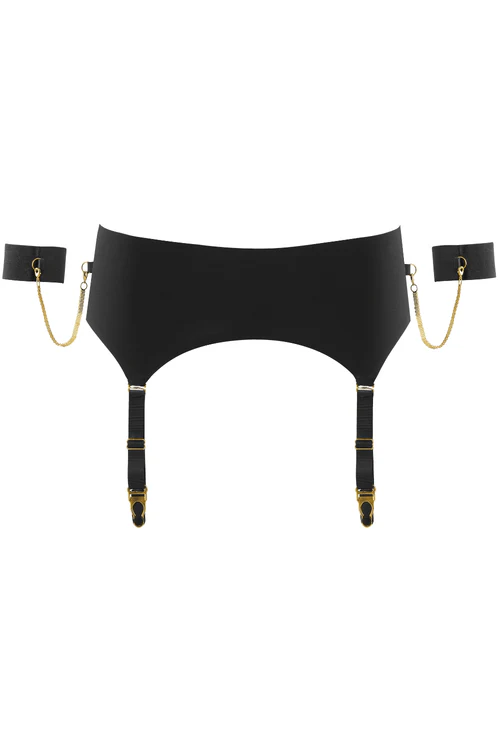 Discover black lingerie from Maison Close. The Tapage Nocturne Garter Belt is a true statement piece for any lingerie lover… Featuring both removable cuffs & golden chains. Embrace those femme fatale vibes.