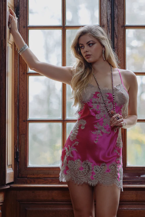 Introducing the Venus Nightie by Marjolaine, a stunning luxury nightwear that embodies elegance and sensuality. This exquisite nightie features a beautiful combination of pink and grey hues. Delicate lace inlays enhance the design, adding a touch of romance and femininity. The seductive open back adds an alluring twist, perfect for intimate evenings or special occasions.